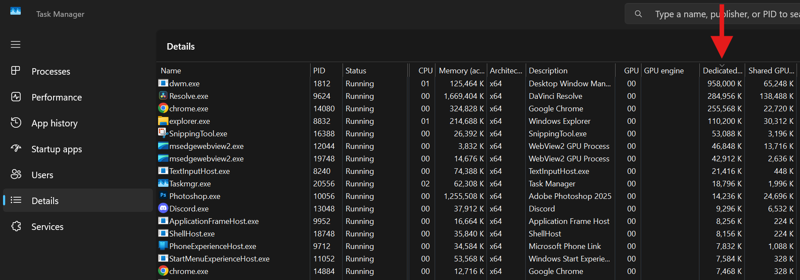 After enabling the columns, you can sort by "Dedicated GPU memory" to see which applications are using the most VRAM, as shown in the image below. Now you can proceed to the final step: